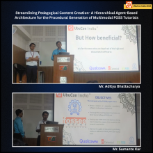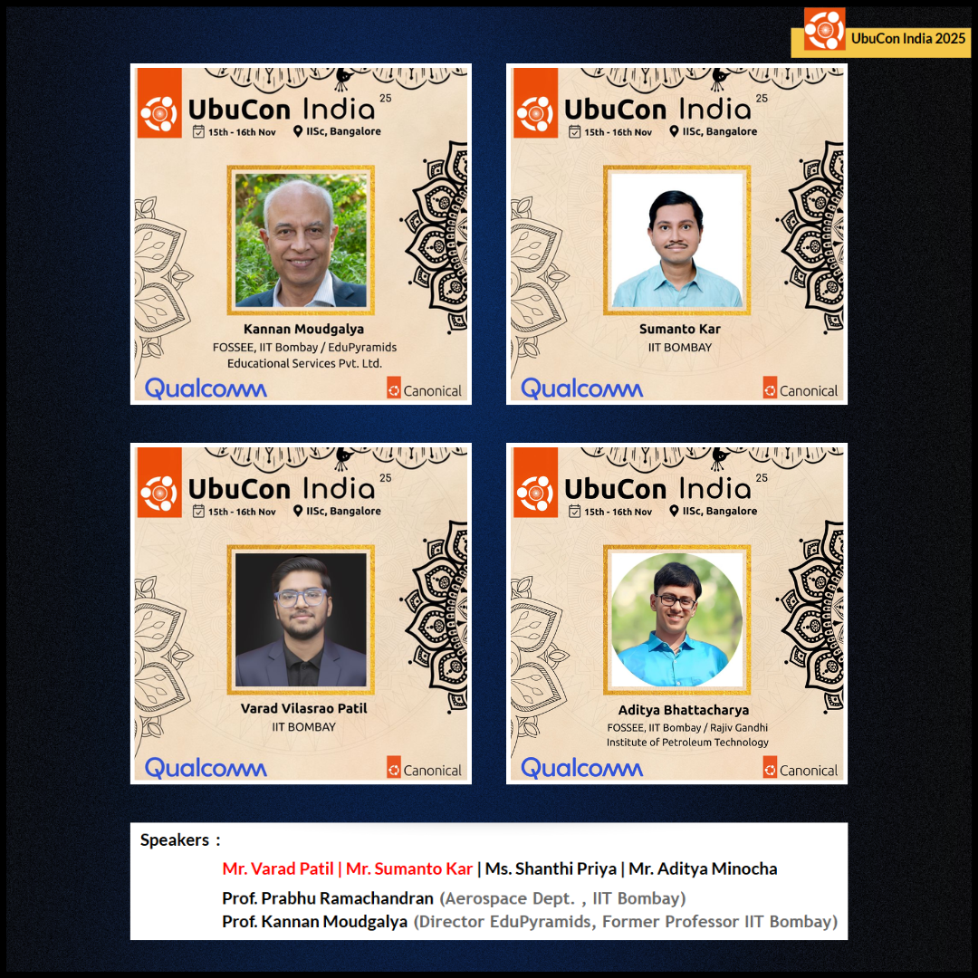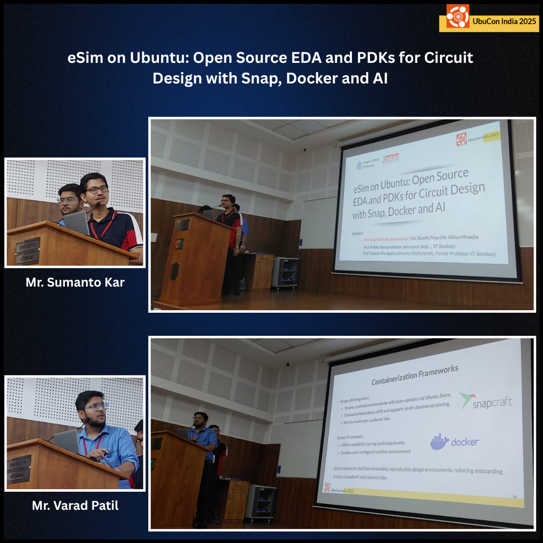 In November 2025, the FOSSEE team presented two significant talks at UbuCon India 2025, held at the prestigious Indian Institute of Science (IISc), Bengaluru, hosted in the Department of Computer Science and Automation (CSA). On 15 November, the session titled “eSim on Ubuntu: Open Source EDA and PDKs for Circuit Design with Snap, Docker and AI” highlighted the evolution of eSim as a comprehensive open-source EDA toolchain. Delivered by Sumanto Kar, Varad Patil, Shanthi Priya and Aditya Minocha, along with insights from Prof. Prabhu Ramachandran (Aerospace Engineering, IIT Bombay), the talk demonstrated eSim’s integrated schematic capture, Ngspice/Verilator simulation, mixed-signal workflows, support for open-source PDKs, and the use of Snap & Docker for scalable, reproducible deployments across academic and research environments.On 16 November, FOSSEE contributed to the Artificial Intelligence & Machine Learning track with the talk “Streamlining Pedagogical Content Creation – A Hierarchical Agent-Based Architecture for the Procedural Generation of Multimodal FOSS Tutorials.” Presented by Aditya Bhattacharya (RGIPT), Sumanto Kar (FOSSEE, IIT Bombay), and Prof. Kannan Moudgalya (Director, EduPyramids and Former IIT Bombay Professor), this session was also conducted at the CSA Department, IISc. The presentation showcased an AI-driven framework designed to autonomously generate structured, multimodal educational content for FOSS tools, demonstrating how hierarchical agents can accelerate tutorial creation, enhance consistency, and support large-scale dissemination of open-source learning resources.