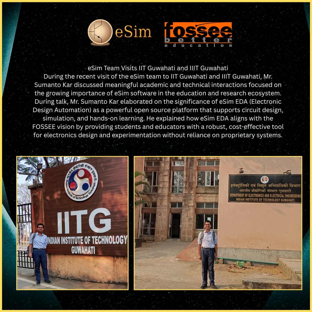 During the recent visit of the eSim team to IIT Guwahati and IIIT Guwahati, Mr. Sumanto Kar discussed meaningful academic and technical interactions focused on the growing importance of eSim software in the education and research ecosystem.