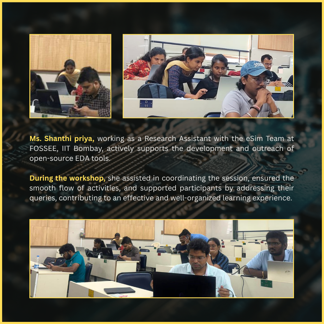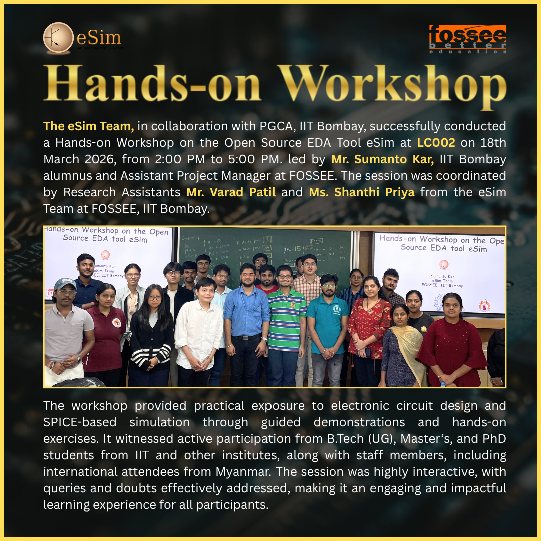The eSim Team, in collaboration with PGCA, IIT Bombay, conducted a Hands-on Workshop on the Open Source EDA Tool eSim at LC002 on 18th March 2026, from 2:00 PM to 5:00 PM, led by Mr. Sumanto Kar, IIT Bombay alumnus and Assistant Project Manager at FOSSEE. The session was coordinated by Research Assistants Mr. Varad Patil and Ms. Shanthi Priya from the eSim Team at FOSSEE, IIT Bombay.The workshop provided practical exposure to electronic circuit design and SPICE-based simulation through guided demonstrations and hands-on exercises. It witnessed active participation from B.Tech (UG), Master’s, and PhD students from IIT and other institutes, along with staff members, including international attendees from Myanmar. The session was highly interactive, with queries and doubts effectively addressed, making it an engaging and impactful learning experience for all participants.