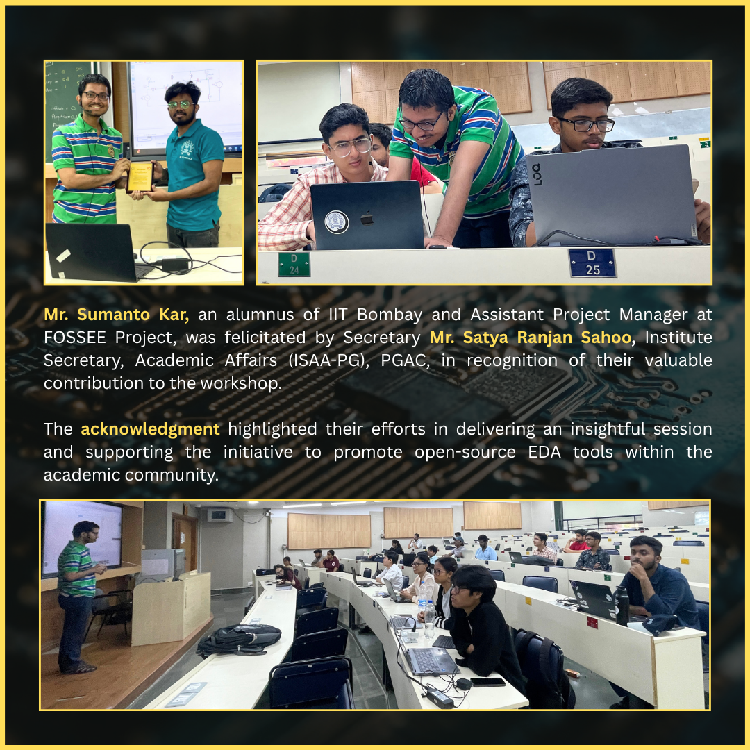 During talk, Mr. Sumanto Kar elaborated on the significance of eSim EDA (Electronic Design Automation) as a powerful open source platform that supports circuit design, simulation, and hands-on learning. He explained how eSim EDA aligns with the FOSSEE vision by providing students and educators with a robust, cost-effective tool for electronics design and experimentation without reliance on proprietary systems.