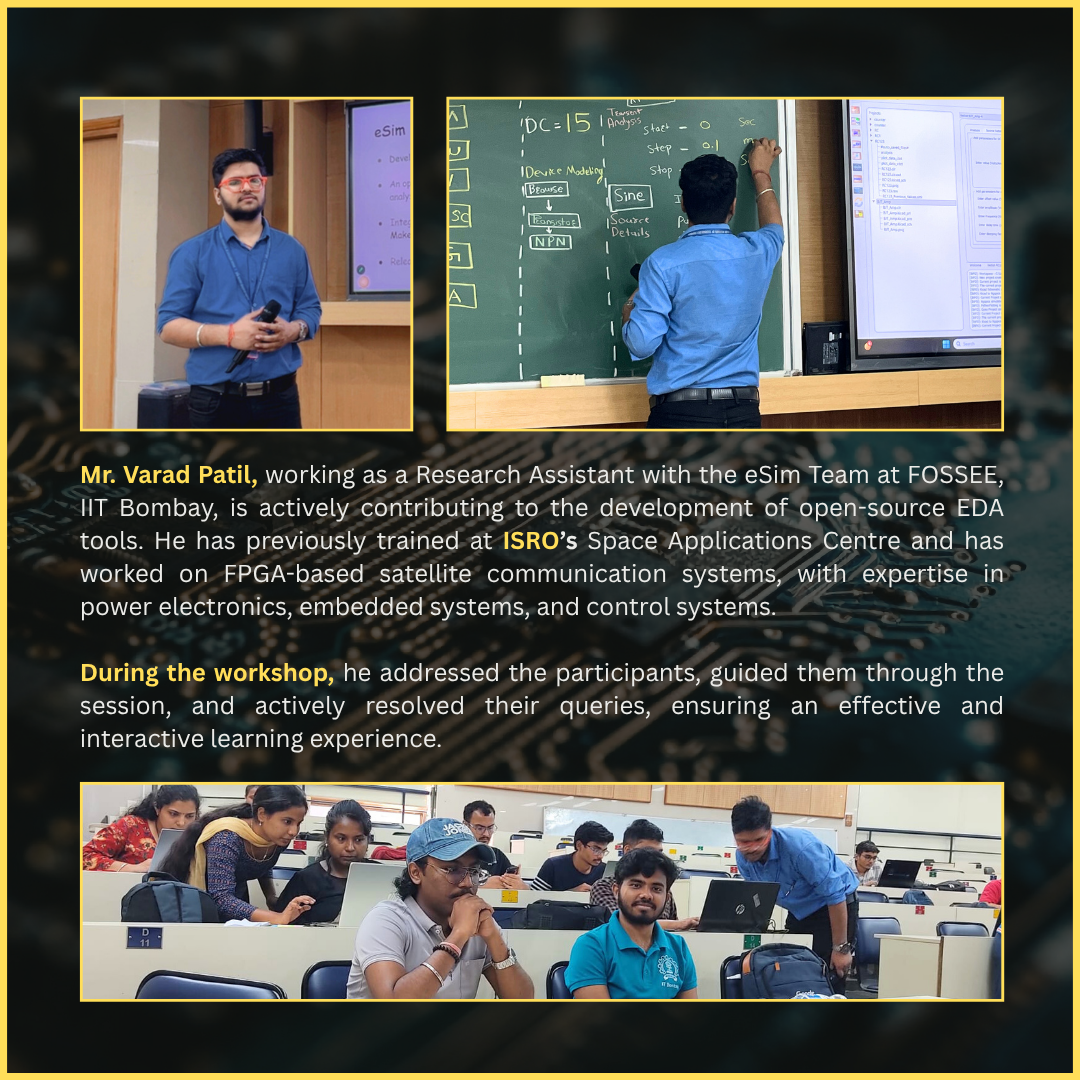 The session was delivered by Mr. Sumanto Kar, Assistant Project Manager, FOSSEE, IIT Bombay, who provided detailed insights into eSim and its open-source workflow. The camp included a hands-on session where students gained practical exposure to circuit design and simulation using eSim. Various academic, research, and project opportunities that can be explored through eSim were also discussed. We extend our sincere gratitude towards Shri. Varad Patil for coordinating and facilitating communication with the college.