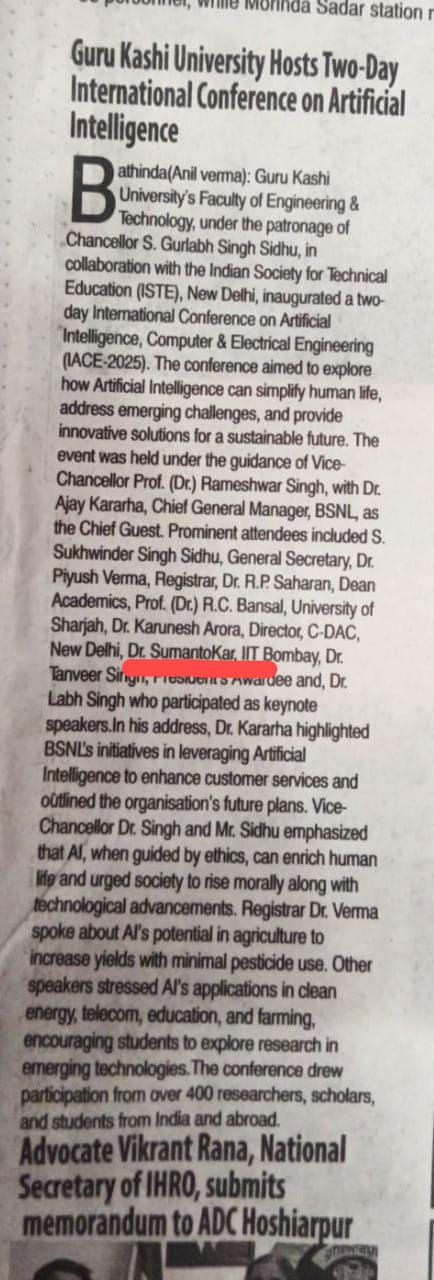 Mr. Sumanto Kar from the eSim Team, FOSSEE, IIT Bombay participated as a Keynote Speaker at the International Conference on Artificial Intelligence, Computer and Electrical Engineering (IACE 2025) held at Guru Kashi University, Bathinda (Punjab). He delivered a talk on “FOSSEE and its Contributions to AI”. During the event, Ms. Vineeta Parmar was recognized for her outstanding contribution in the field of IT. The conference, attended by over 400 participants from India and abroad, featured several eminent speakers and academicians. Mr. Sumanto Kar also visited NITTTR Chandigarh, where he delivered an interactive session for over 27 faculty members from various institutions, exploring potential collaboration opportunities with FOSSEE.